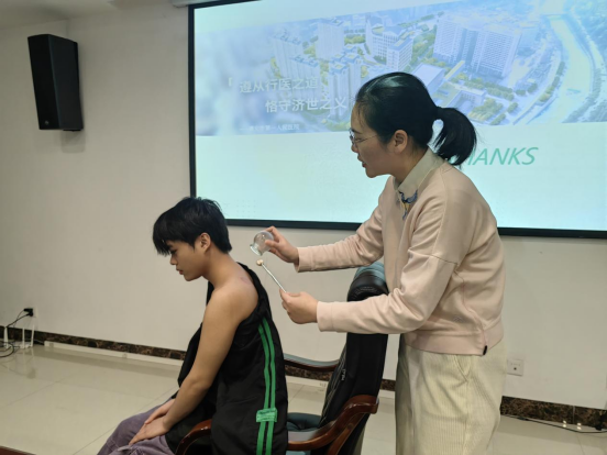 孟丹博士首先以生动的图文资料,深入浅出地阐释了中医文化与中国哲学的关系,从中医中的阴阳、五行等传统文化精髓到“辩证论治”等方面进行了介绍,着重讲解了中医的针刺疗法、艾灸疗法、刮痧疗法和拔罐疗法等中医传统自然疗法,讲座中还向参加讲座的国际学生展示了中医临床治疗常用的针具、艾灸器、刮痧板、拔罐器等器具。接着,孟丹博士现场“坐诊”,为多位国际学生进行现场针灸、拔火罐、刮痧,让国际学生真切感受中医传统疗法,同学们对中医独特而神奇的治疗产生了极大的兴趣,纷纷惊叹中医疗法的神奇。讲座最后,孟丹博士还现场教授了中国古老的导引术——八段锦,并对动作要领进行一一指导。