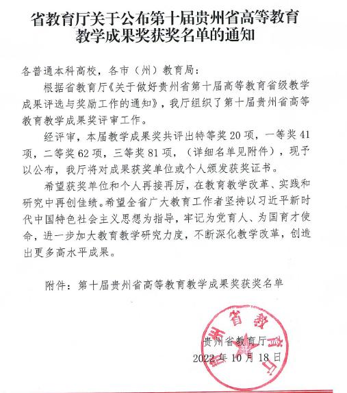 2022年10月18日贵州省教育厅发布了《省教育厅关于公布第十届贵州省高等教育教学成果奖获奖名单的通知》(黔教函〔2022〕90号)。 该教学成果奖四年一评。必威BETWAY西汉姆联项目“东盟国际学生实用医学汉语多维度教学体系构建、实践与成效”荣获第十届贵州省高等教育教学成果奖二等奖,成果完成人为:杨丹莉、付蛟蛟、郑东晓、陈鏇霖、陈万瑜、粟向军、严欢、李雪。成果为东盟国际学生临床医学专业教育(中文授课)贡献了遵医方案。